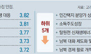 민간택지 분양가 상한제와 소득주도성장, 북한 비핵화 등 정부가 올해 시행한 경제와 외교안보 정책이 줄줄이 낙제점을 받았다. 시장에 지나치게 개입하거나 국민 기대를 거스르는 일방통행식 정책이 국민으로부터 외면받고 있는 것이다. 이는 동아일보가 고려대 정부학연구소, 여론조사기관 한국리서치와 함께 올해 정부 각 부처가 시행한 △경제 △사회복지 △교육문화 △외교안보 4개 분야 40개 정책을 선정해 실현 가능성과 만족도 등을 분석한 ‘2019년 대한민국 정책평가’ 결과다. 평가 결과에 따르면 보통(3점) 미만을 받은 9개 정책 중 경제 관련 정책이 5개, 외교안보 정책이 4개였다. 가장 낮은 점수를 받은 정책은 5점 만점에 2.55점을 받은 국토교통부의 민간택지 분양가 상한제 정책이었다. 정부는 분양가를 낮춰 집값을 안정시키려는 취지로 이 정책을 추진했지만 청약 경쟁률이 치솟고 신축 아파트 가격이 급등하는 부작용이 이어지고 있다. 현 정부 경제 정책의 핵심인 소득주도성장은 지난해 40위에서 올해 39위로 최하위권을 벗어나지 못했다. 정부가 최저임금 인상과 주 52시간 근로제 등의 정책 추진 속도를 조절하고 있지만 지난 3년간 소상공인들이 받은 피해를 만회하기엔 역부족이라는 해석이 나온다. 지난해 높은 점수(3.44점)를 받으며 10위권에 들었던 남북관계 관련 정책은 ‘북한 비핵화 촉진’(2.82점) ‘남북 경제 활로 개척’(2.84점) 등이 별다른 성과를 내지 못하며 하위권으로 밀려났다. 정부 기대와 달리 북한의 미사일 도발이 끊이지 않는 등 북핵 문제가 해결의 실마리를 찾지 못하면서 대북정책에 대한 국민의 피로도가 쌓이고 있어서다. 미국과 방위비 분담, 일본과 군사 협력 등 한반도를 둘러싼 4개국(미국 중국 일본 러시아)과의 불협화음이 이어지며 주변 4개국과의 외교도 낙제점을 면치 못했다. 반면 일본산 수입 식품 분쟁에서 승소(1위)하고 소재·부품·장비 연구개발을 추진한 것(13위) 등 이른바 ‘극일(克日) 정책’이 호평을 받았다. 의료비 부담 경감(2위) 및 국민기초생활 보장(3위) 등 양극화 해소를 위한 복지 정책도 높은 점수를 받았다. 정부에 대한 신뢰도는 박근혜 정부 당시인 2015년 2.38점에서 현 정부 첫해인 2017년 3.27점으로 급등했다가 올해 2.82점으로 하락했다. 최진욱 고려대 행정학과 교수는 “좋은 의도의 정책이라도 효과가 나타나지 않거나 목표와 반대되는 결과가 나오면 높은 점수를 받지 못한다”며 “정부 출범 시 국민이 갖고 있던 기대가 정책으로 충족되지 않으면서 신뢰도가 떨어진 것으로 보인다”고 말했다. 세종=송충현 balgun@donga.com / 이미지·한기재 기자}
