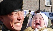 아빠의 품에서 울음을 터뜨린 갓난 아들은 아빠와 잠시 떨어져야 한다는 걸 아는 걸까. 올해 첫 해외 파병부대인 아랍에미리트 군사훈련협력단 ‘아크부대’ 5진 파병 환송식이 경기 광주시 오포읍 육군 특수전교육단에서 열렸다. 광주=전영한 기자 scoopjyh@donga.com}