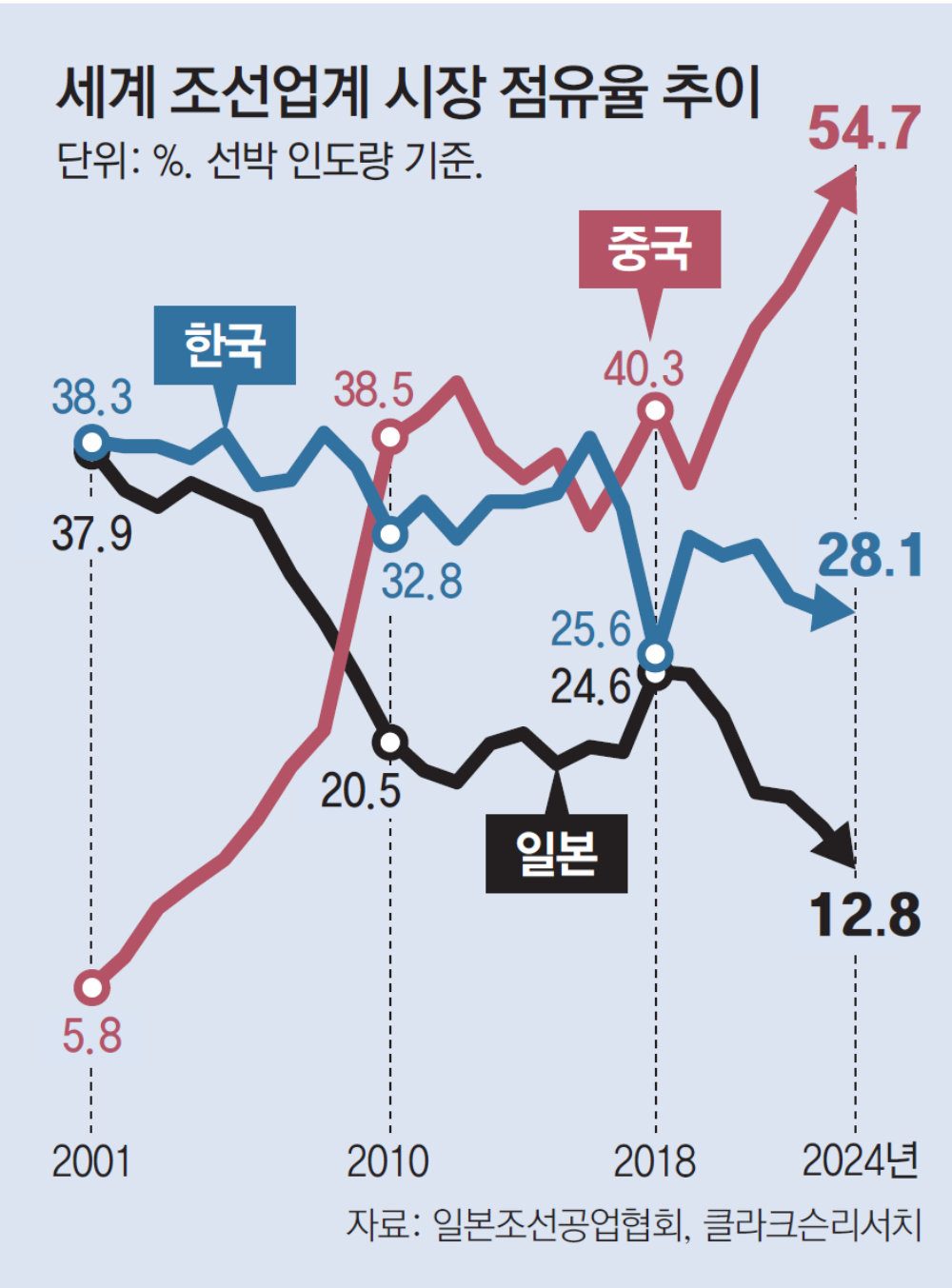 일본의 해운사와 조선사들이 한국과 중국에 뒤처진 자국 조선업 경쟁력을 키우기 위해 처음으로 손을 맞잡았다. 일본은 1970, 80년대만 해도 전 세계 선박 건조 점유율의 절반을 차지했지만 이제는 중국, 한국에 밀려 3위로 뒤처졌다. 중국을 견제하기 위해 미국이 한국과 조선업 협력 프로젝트인 ‘마스가(MASGA·미국 조선업을 다시 위대하게)’를 추진 중인 가운데 일본 산업계도 본격적인 조선업 역량 되살리기에 나선 것으로 해석된다.27일 니혼게이자이신문(닛케이)은 일본 해운사와 조선사들이 조선업 경쟁력 회복을 위해 처음으로 ‘원팀’을 구성했다고 전했다. 일본우선(NYK), 상선미쓰이, 가와사키기선 등 해운 대기업 3사가 이마바리조선, 미쓰비시중공업이 공동 출자하는 선박 설계사 마일스(MILES)에 자본 참여를 결정한 것. 현재 미쓰비시중공업은 마일스 지분의 51%를, 이마바리조선은 49%를 각각 소유하고 있다. 이 중 이마바리조선의 지분 일부를 해운 3사에 양도하는 방식으로 경영 참여가 이뤄질 전망이다. 닛케이는 “일본 해운사와 조선사가 자본 측면에서 하나가 돼 선박 개발 체제를 구축하는 건 처음”이라고 전했다. 해운 3사는 차세대 선박의 설계 기반을 마일스로 집약해 사양 요구를 반영하고, 설계 범위도 보다 다양한 선종으로 확대할 방침이다. 표준화된 설계 모델을 만들어 일본 조선업 전반의 효율성과 경쟁력을 끌어올리는 게 목표다. 그동안 한국과 중국 조선사에 발주해 왔던 LNG 운반선도 일본으로 돌리며 자국 생산량을 늘릴 계획이다. 일본 정부도 조선업 부활을 위한 지원과 제도 정비에 본격 나서고 있다. 일본은 2035년까지 현재의 건조량을 두 배로 늘리는 것을 목표로 세웠다. 이를 달성하기 위해 정부와 조선업계가 약 3500억 엔(약 3조3000억원)씩 출연하는 등 민관이 총 1조 엔(약 9조4000억원)을 투자키로 했다. 일본 공정거래위원회는 기업 간 통합·합병을 다루는 독점금지법을 조선업에 대해선 유연하게 적용하기로 했다. 일본 공정위는 18일 일본 최대 조선업체인 이마바리조선이 2위 업체인 저팬마린유나이티드(JMU)의 지분을 추가 매입해 자회사화하는 계획을 승인했다. 두 회사의 일본 내 시장 점유율을 합치면 50%가 넘지만, 한국 및 중국에 맞서 조선업 경쟁력을 끌어올리는 게 시급하다고 판단한 데 따른 것이다. 시장조사 기관 클라크슨 리서치에 따르면 지난해 기준 세계 조선업 점유율(선박 인도량 기준)은 중국 54.7%, 한국 28.1%, 일본 12.8%, 미국 1% 미만이다. 미국은 중국의 조선업을 견제하고 국방력을 강화하기 위해 동맹인 한국, 일본의 조선업 협력을 강조하고 있다. 닛케이는 “조선업은 일본의 경제안보뿐 아니라 트럼프 행정부와의 협력을 위해서도 중요성이 높아졌다”고 진단했다.도쿄=황인찬 특파원 hic@donga.com이지윤 기자 asap@donga.com}