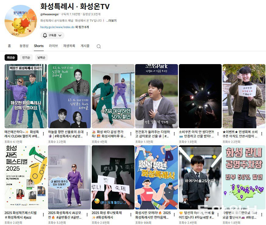경기 화성시가 올해 페이스북·인스타그램·유튜브 등 주요 홍보 플랫폼 전 분야에서 ‘5관왕’을 달성했다.화성시는 26일 열린 ‘제11회 2025 올해의 SNS’ 시상식에서 3개 부문(페이스북·인스타그램·유튜브)에서 대상을 받았다. 이 상은 한국소셜콘텐츠진흥협회가 주최하고 과학기술정보통신부가 후원하는 SNS 분야에서는 최고 권위의 상이다. 공공기관·기업·개인의 디지털 소통 역량을 공식적으로 검증받는 전국 단위의 평가다.28일에는 ‘제3회 한국공공브랜드대상’에서 디지털마케팅 부문 대상을 수상한다. 화성시는 지난달 ‘제15회 2025 대한민국 SNS 대상’에서도 공공분야 최우수상을 차지했다.● 전국 최고 홍보 역량 입증‘2025 올해의 SNS’ 시상식에서 페이스북·인스타그램·유튜브 3개 부문 대상 수상은 지난해 블로그·유튜브 부문 최우수상에 이어 온라인 홍보 분야에서 연속적으로 경쟁력을 인정받았다. 3개 부문을 동시 수상은 전국 지자체 가운데서도 드문 성과다. SNS 콘텐츠 품질·전략성·효과성 등 전 분야에서 전문 심사단과 일반 사용자 모두에게 경쟁력을 인정받았음을 의미한다. 평가는 공정성을 확보하기 위해 △정량평가 40% △외부 심사위원 평가 60%의 구조로 운영된다. 정량평가에는 SNS 영향력을 계량화하는 KoSBI 지수가 활용된다. 외부 심사에는 콘텐츠의 질, 스토리텔링, 활동성, 소통성 등을 중심으로 전문적 검증이 이뤄진다. 심사위원단은 소셜미디어, 브랜딩, 디지털 커뮤니케이션 분야의 전문가들로 구성돼 평가의 객관성과 전문성을 높였다.화성시는 특정 플랫폼에 의존하지 않고 전 매체에서 고르게 성과를 내는 데 집중했다. 플랫폼별 이용층과 정보 소비 방식이 다른 점을 고려하면, 이러한 성과는 시가 다양한 시민 그룹에 적합한 방식으로 정책 콘텐츠를 신속하게 전달할 수 있는 실질적 소통 능력을 확보했다는 의미로 해석된다.●‘양’과 ‘질’ 두 마리 토끼 잡다화성시는 올해 온라인 홍보의 ‘양’과 ‘질’ 모두에서 뚜렷한 성장세를 보였다. 9월 기준 시가 운영하는 온라인 매체는 △페이스북 △인스타그램 △유튜브 △블로그 △카카오 채널 △당근 공공프로필 △통합예약시스템 등 8개 플랫폼이다. 누적 게시물은 1만2434건으로 1년 전에 비해 운영 규모와 콘텐츠 집행 건수가 크게 늘었다.이러한 성장세는 대표 홍보 채널인 유튜브에서 더욱 뚜렷하게 나타난다. 지난달 기준, 화성시 공식 유튜브 ‘화성특례시·화성온TV’는 구독자 7만 명을 넘어 전국 226개 기초지자체 중 2위에 올랐다. 조회 수 또한 1231만 회를 돌파해 구독 규모와 콘텐츠 소비력 모두에서 양적·질적 성장을 동시에 달성했다.다른 지자체에서는 드문 인공지능(AI) 기반 미니어처 영상 시리즈(수향미·바지락·송산포도)를 선보이며, 단순한 특산물 홍보를 넘어 첨단 기술로 지역 브랜드의 감성과 가치를 새롭게 표현한 시도로 호평을 받았다.무엇보다도 올해 화성시의 구독자·팔로워 수 역시 큰 폭으로 상승했다. △유튜브는 전년 대비 2만407명(39.9%) △인스타그램 1만3649명(31.6%) △카카오톡 채널 6313명(6.4%) 등 모든 플랫폼에서 성장세를 기록했다.● 시작이 다르니 결과도 다르다 ‘홍보 5관왕’ 성과의 핵심 배경에는 대변인과 홍보 담당관이 주재하는 ‘커뮤니케이션 전략회의’가 있다. 화성시는 이 회의를 통해 홍보 메시지를 일관되게 정리하고 이를 전 매체에 전략적으로 확산시켜 왔다.이러한 ‘커뮤니케이션 전략회의’를 매달 1회 이상 운영하며 주요 정책·행사의 홍보 메시지와 매체별 홍보전략을 체계적으로 검토해 왔다. 회의에는 홍보담당관과 해당 정책과 사업을 맡은 부서도 함께 참여해 정책 의도와 세부 내용을 기반으로 한 정확한 메시지 설정이 이뤄지고 있다.회의에서는 보타닉가든 홍보전략, 화성시 AI 박람회 홍보 방향 등 주요 현안은 물론, 화성동탄중앙도서관, 화성예술의전당 개관 등 다양한 분야의 홍보 과제가 논의되며 시정 전 영역으로 전략적 확장성을 확보해 왔다.이렇게 수립된 홍보전략은 SNS·유튜브·시정소식지·홈페이지 등 온라인 매체와 아파트 EV 미디어보드·BIS·U플래카드 등 생활권 홍보 매체로까지 확산하며 홍보 메시지가 일관되게 전달되는 환경을 구축하는 데 크게 기여했다.정책의 네이밍과 정체성을 설계하는 정책 브랜드 자문단 회의도 성과의 핵심 동력으로 작용했다. 자문단은 브랜딩·홍보·스토리텔링 전문가 등 16명으로 구성돼 있으며, 정책의 핵심 가치를 시민 중심의 언어로 정교화하는 역할을 하고 있다.올해는 서해안 황금해안길 네이밍, 화성시청년지원센터 네이밍, 화성뱃놀이축제 슬로건 등 시정 전반의 공간·사업·행사 네이밍을 자문하며 화성특례시 정책 브랜드의 정체성과 품질을 한층 강화했다.●정명근 시장 “미디어 변화 맞춰 홍보 역량 발전”정명근 화성시장은 “‘홍보 5관왕’ 성과는 화성시의 홍보 체계가 기획 단계부터 콘텐츠 제작, 시민 도달에 이르기까지 전 과정에서 체계적으로 구축돼 있음을 보여주는 결과”며 “효과적인 홍보를 끊임없이 고민해 온 공직자들과 지속적인 관심을 보내 주신 시민들이 함께 만들어낸 성과”라