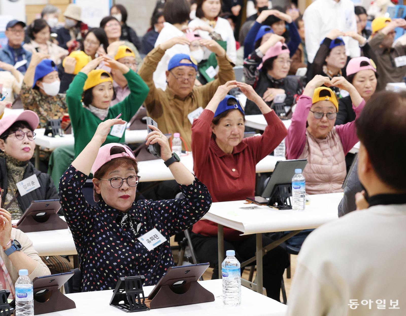 27일 서울 노원구청에서 열린 ‘도전! 노원 어르신 디지털 골든벨’에서 참가자들이 스마트기기를 이용해 OX 퀴즈를 풀고 있다. 행사에서는 스마트폰과 태블릿PC로 키오스크 사용법 관련 문제를 보고 답하는 방식으로 진행됐다. 신원건 기자 laputa@donga.com}