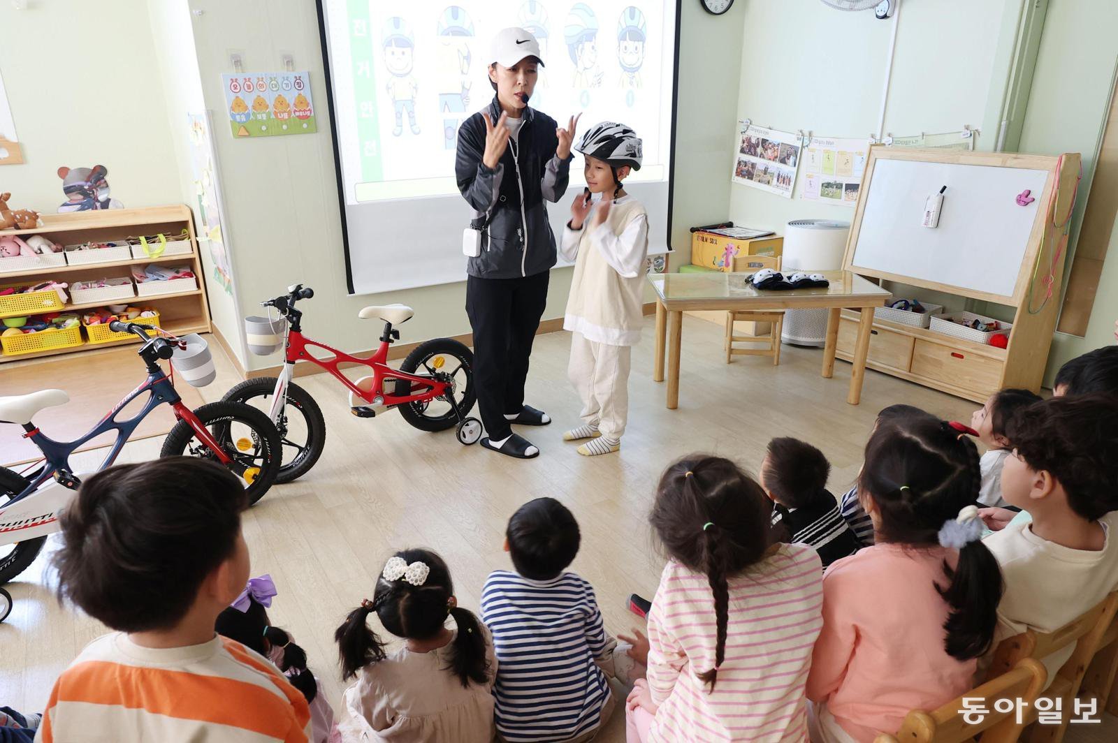 29일 서울 송파구 석촌동 새싹어린이집에서 원생들이 자전거 보호장구 착용 방법 등에 대해 배우고 있다. 이날 송파구는 원생들을 대상으로 ‘찾아가는 자전거 안전교육’을 열었다. 신원건 기자 laputa@donga.com}