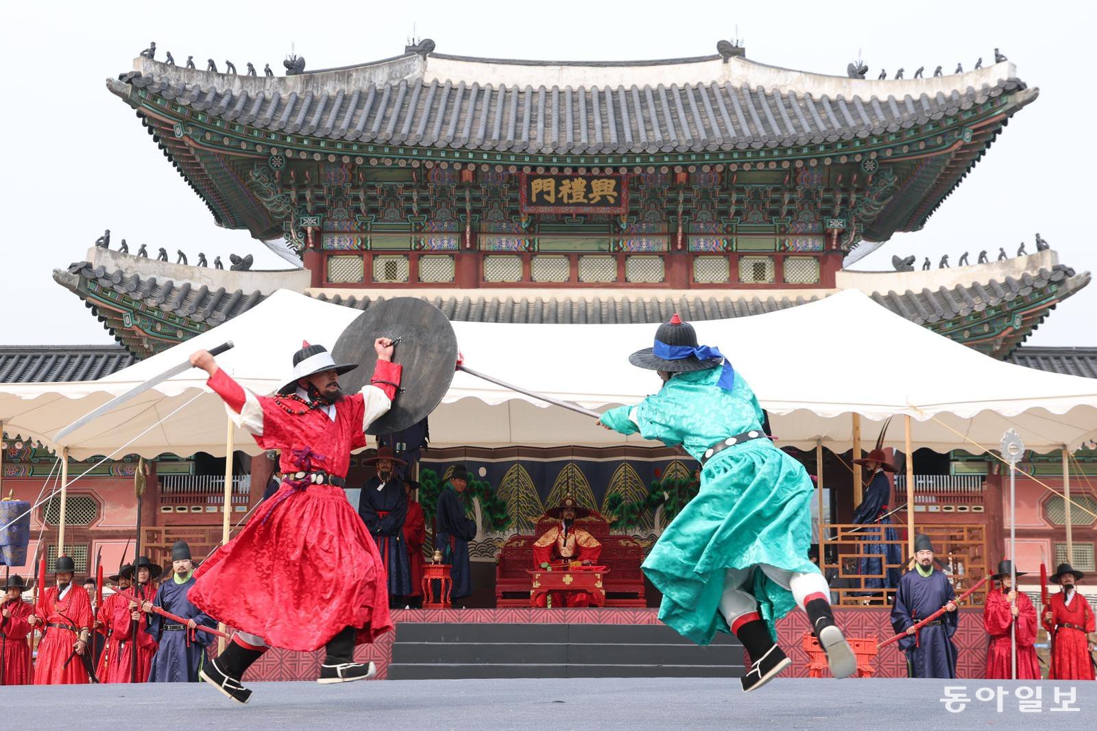 30일 서울 종로구 경복궁 흥례문광장에서 열린 ‘첩종(疊鐘)’ 재현 행사를 하루 앞두고 연기자들이 사열 의식을 시연하고 있다. 첩종은 국왕이 비상사태에 대비해 호위군을 점검하던 조선시대 군사 의식으로, 국가유산청 궁능유적본부는 31일부터 다음 달 2일까지 극 형식으로 재현 행사를 진행한다.신원건 기자 laputa@donga.com}