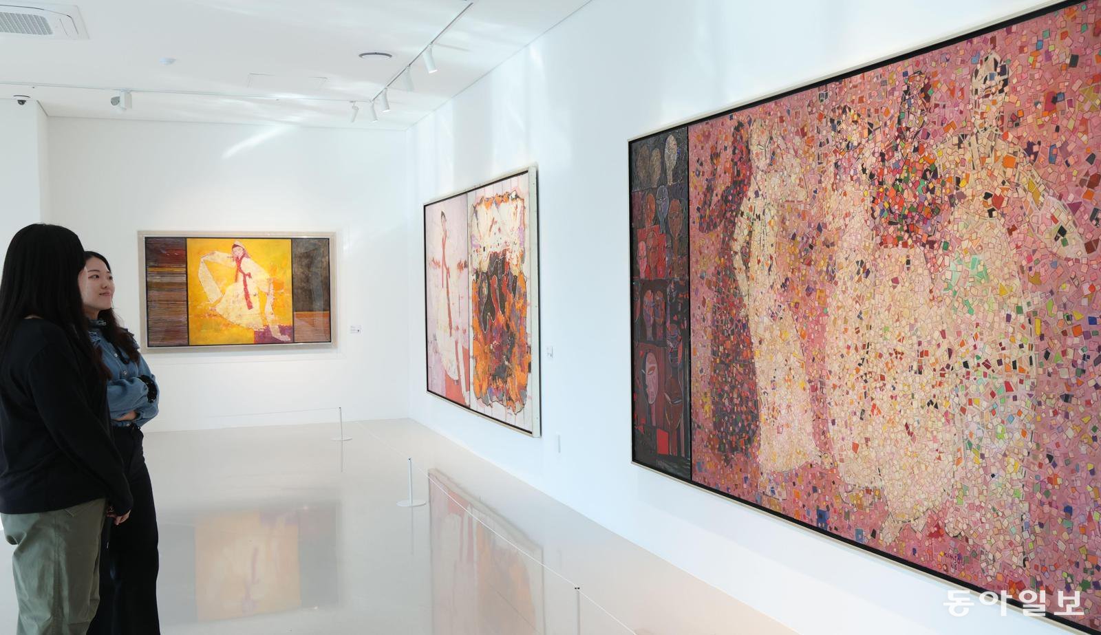 2일 서울 송파구 구립 더호수갤러리에서 관람객들이 근현대미술 거장 김흥수 화백(1919∼2014)의 작품을 감상하고 있다. 이곳에서는 21일까지 회고전 ‘김흥수: 하모니즘’이 열려 평면 회화와 드로잉 등 40여 점이 전시된다.신원건 기자 laputa@donga.com}