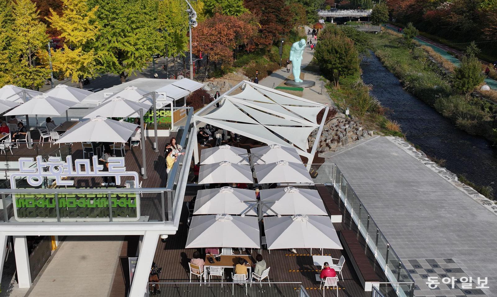 13일 오후 서울 노원구 당현천변 ‘노원 당현마루’에서 시민들이 휴식을 취하고 있다. 지난달 30일 문을 연 이 공간에는 수변 전망대, 카페, 달빛브릿지, 라면존 등이 조성됐다.신원건 기자 laputa@donga.com}