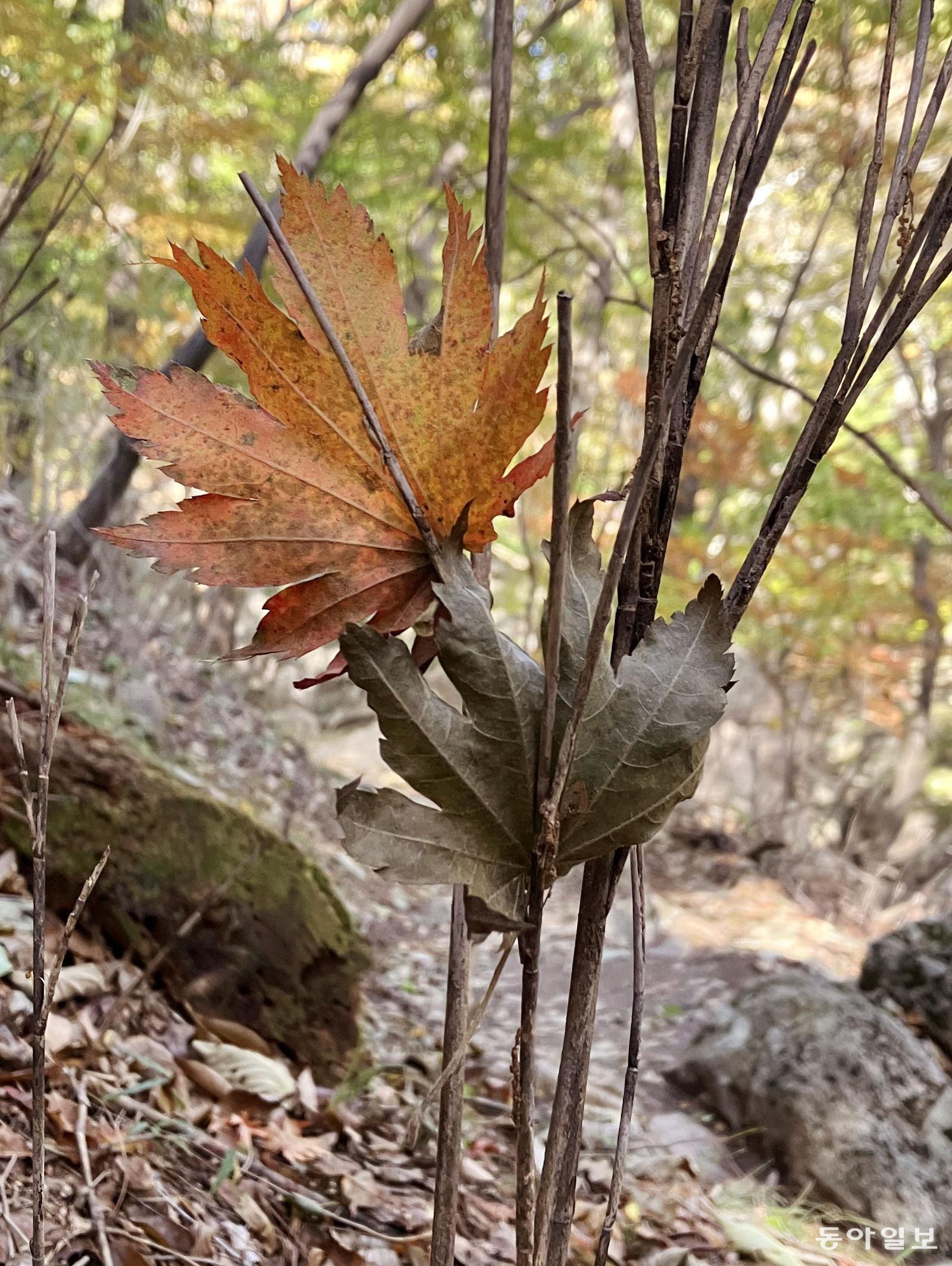 휑하니 가지만 남은 키 작은 나무에 낙엽 두 장이 걸렸습니다. 숲을 떠나기 싫은 낙엽이 잠시 단풍나무 흉내를 내는 듯해 절로 미소가 지어집니다. ―충북 보은군 속리산에서신원건 기자 laputa@donga.com}