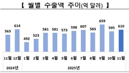 한국의 11월 수출이 전년 대비 8.4% 증가하면서 동월 기준 역대 최대 실적을 경신했다. ‘슈퍼사이클’을 맞은 반도체가 수출 증가세를 이끌면서 올해 6월부터 6개월 연속 월간 최대 실적을 거두고 있다. 올 들어 11월까지 누적 수출도 6400억 달러를 넘기며 역대 최대 실적을 3년 만에 갈아치웠다. 한동안 반도체 호실적이 이어질 것으로 예상되는 데다 한국산 자동차 및 부품에 대한 미국의 품목 관세 인하(25→15%)가 11월1일 자로 소급 적용될 예정인 만큼 올해 한국의 수출 목표(7000억 달러) 달성에도 청신호가 켜졌다.1일 산업통상부는 ‘11월 수출입 동향’을 통해 지난달 한국의 수출액이 610억4000만 달러로 전년 동월 대비 8.4% 증가했다고 밝혔다. 한국의 월간 수출액은 올해 6월부터 지난달까지 6개월 연속 월간 최대 실적을 갈아치우고 있다. 한국의 수출 증가세는 슈퍼사이클을 맞은 반도체가 이끌고 있다. 11월 반도체 수출은 지난해보다 38.6% 급증한 172억6000만 달러로 집계됐다. 11월 뿐만 아니라 전체 월별 기준으로도 역대 최대다. 반도체 수출액은 데이터센터를 중심으로 고부가 메모리에 대한 높은 수요가 메모리 가격 상승세로 이어지면서 9개월 연속 성장세다.11월 자동차 수출 또한 내연기관과 하이브리드차의 호실적에 힘입어 지난해보다 13.7% 증가한 64억1000만 달러로 나타났다. 특히 미국으로의 수출 실적도 25%의 고율 품목 관세 부과를 이겨내고 1년 전보다 11% 증가한 22억 달러로 확인됐다. 11월 수입은 513억 달러로 전년 대비 1.2% 늘었다. 이에 따라 지난달 무역수지는 97억3000만 달러 흑자로 나타났다. 전년 대비 41억7000만 달러 증가한 규모다.한동안 한국의 수출 증가세가 이어질 것으로 예상되면서 올해 수출 목표치였던 7000억 달러 달성에도 청신호가 켜졌다. 11월까지의 누적 수출은 6402억 달러로 종전 최대치였던 2022년(6287억 달러) 실적을 3년 만에 넘어선 상태다. 전세계적으로 반도체 수요 증가세가 견조한 데다 최근 ‘한미 전략적 투자 관리를 위한 특별법’ 발의로 한국산 자동차 및 자동차 부품에 부과되던 미국의 품목 관세 인하((25→15%)가 11월 1일자로 소급 적용될 수 있는 토대가 마련된 점도 한국 수출에 호재로 작용할 것으로 전망된다. 산업부 관계자는 “한국산 자동차 및 자동차 부품의 품목 관세를 인하하는 내용을 담은 미 측의 연방관보가 조만간 게재될 것으로 기대 중”이라며 “관세가 인하되면 대미 자동차 수출에도 긍정적인 영향을 줄 것”이라고 설명했다.세종=정순구 기자 soon9@donga.com}