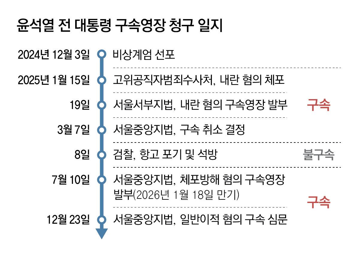 법원이 ‘평양 무인기(드론) 작전’과 관련해 일반이적 혐의를 받는 김용현 전 국방부 장관과 여인형 전 국군방첩사령관에 대해 추가 구속영장을 발부했다. 이에 따라 공범 관계인 윤석열 전 대통령에 대해서도 법원이 같은 취지로 추가 구속영장을 발부할 가능성이 높다는 분석이 나온다.● 法, “증거인멸 염려” 세 번째 구속영장 발부윤 전 대통령과 김 전 장관, 여 전 사령관 등의 일반이적 혐의 1심 재판을 맡은 서울중앙지법 형사합의36부(부장판사 이정엽)는 24일 김 전 장관과 여 전 사령관에 대해 “증거를 인멸할 염려가 있다”며 구속영장을 발부했다. 김 전 장관은 비상계엄을 주도한 내란중요임무종사 혐의와 대통령경호처를 속여 민간인 노상원 전 국군정보사령관에게 ‘비화폰’을 지급한 혐의에 이어 세 번째 구속영장이다. 여 전 사령관도 지난해 12월 계엄 당일 방첩사 요원들을 동원한 내란중요임무종사 혐의로, 올 6월에는 위증 혐의로 구속됐다. 법원은 김 전 장관의 구속이 25일 밤 12시, 여 전 사령관은 29일 밤 12시에 각각 만기되는 점을 감안해 영장 발부를 결정했다.법원의 이번 결정은 특검이 내세운 구속 필요성을 인정한 것으로 풀이된다. 재판부는 ‘평양 드론 작전’이 군 내에서도 소수 인원만 공유하며 은밀하게 진행된 작전이라는 점에 주목했다. 핵심 군 간부였던 이들이 석방될 경우 작전을 실행했던 드론사령부 관계자 등 하급자에게 영향력을 행사해 증거를 인멸할 가능성이 크다고 판단한 것이다. 작전의 최종 승인권자인 윤 전 대통령에게도 이와 동일한 논리가 적용될 수 있다.또 법원은 윤 전 대통령 측이 주장해 온 법리적 방어 논리도 사실상 받아들이지 않았다. 윤 전 대통령은 전날 비공개 구속심문에서 “특검이 내란 혐의가 아닌 일반이적 혐의를 적용한 것은 불법적인 이중기소이며 증거인멸 우려도 없다”고 주장했다. 하지만 법원이 같은 혐의를 받는 김 전 장관 등에게 영장을 발부함에 따라, 해당 혐의에 의한 구속의 정당성이 확보된 것으로 보인다.● 尹 추가 구속 여부는 내년 초 결정윤 전 대통령에 대한 추가 영장 발부 여부는 내년 1월 초순경 결정될 것으로 전망된다. 현재 ‘고위공직자범죄수사처(공수처) 체포 방해’ 혐의로 구속된 윤 전 대통령의 구속 기간은 내년 1월 18일까지이기에, 법원은 그 이전에 판단을 내려야 한다. 재판부는 전날 구속심문 절차에서 변호인단에게 “이달 30일까지 추가로 필요한 의견서를 제출하라”고 밝혔다.특검은 추가 구속영장이 발부될 경우 윤 전 대통령이 수감된 서울구치소에서 추가 영장을 집행할 계획이다. 이 경우 윤 전 대통령의 구속 기간은 내년 7월까지 최장 6개월 연장된다. 그 이후에도 윤 전 대통령이 석방될 가능성은 크지 않다는 관측이 나온다. 현재 진행 중인 여러 재판에서 순차적으로 선고와 추가 영장 집행이 이어질 수 있기 때문이다.당장 내년 1월 16일에는 윤 전 대통령의 공수처 체포 방해 혐의에 대해 1심 선고가 예정돼 있다. 이때 서울중앙지법 형사합의35부(부장판사 백대현)가 징역형을 선고할 경우 윤 전 대통령은 항소심에서 최대 8개월 추가로 구속될 수 있다. 이어 윤 전 대통령의 내란우두머리 혐의 사건도 서울중앙지법 형사합의25부(부장판사 지귀연)가 내년 2월 법관 정기 인사 이전에 선고할 것으로 관측된다. 이 사건에서 법원이 징역형을 선고할 경우에도 윤 전 대통령은 항소심 진행 과정에서 별개로 최대 8개월간 구속될 수 있다.여기에 아직 영장이 청구되지 않은 ‘채 상병 수사 외압 의혹’이나 ‘주호주 대사 임명 의혹’과 관련해 특검이 추가로 구속영장을 청구할 수도 있어, 윤 전 대통령의 수감 생활은 장기화할 가능성이 있다.고도예 기자 yea@donga.com송혜미 기자 1am@donga.com여근호 기자 yeoroot@donga.com}