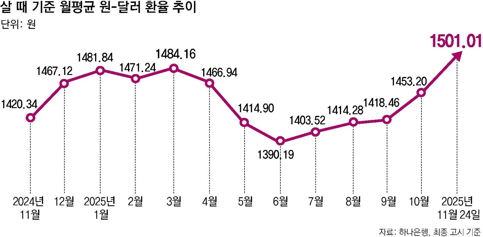 #1. ‘기러기 아빠’ 백모 씨는 지난해 자녀를 미국 매사추세츠주 보스턴의 한 대학에 입학시켰다. 이달 들어 원-달러 환율이 미국 대학 새 학기가 시작된 지난해 9월 평균(1333.8원)보다 10%가량이나 올랐다. 이대로 내년 봄학기가 오면 지출이 작년 학기 초 1억5000만 원대에서 1억7000만 원대로 커지게 생겼다. 백 씨는 “내년에는 아들에게 군대를 가라고 권유하고 있다”고 말했다.#2. 미국 뉴욕의 주재원 송모 씨는 “체재비는 달러로 나오지만, 월급은 한화로 받고 있어 월급을 달러로 환전하려면 1500원 고환율이 버겁다”면서 “주재원 초기 즐겨하던 외식은 못 한 지 오래고, 한국에서도 안 하던 김장을 하고, 난방비 폭탄이 무서워 춥게 산다”고 말했다.원-달러 환율이 매매 기준율 기준 1470원을 돌파한 가운데 인천국제공항에서 원화를 달러화로 환전할 때는 1530원을 넘어선 것으로 나타났다. 시중은행 창구에서 살 때도 환율 우대를 적용받지 않을 경우 1500원을 넘어선 것으로 집계됐다. ● 시중은행 영업점에서도 1500원 넘는 환율25일 금융권에 따르면 인천공항에 환전소를 보유한 KB국민·우리·하나은행의 이날 인천공항 환율은 평균 1536원으로 집계됐다. 은행의 인천공항 출장소는 연중무휴(365일) 환전 영업을 하는 특수성 때문에 일반 영업점보다 높은 환율(매매 기준율 대비 4.2% 부가)을 적용한다.5대 시중은행(KB국민·신한·하나·우리·NH농협)에서 이날 달러화를 살 때 기준 원-달러 환율은 장중 1500원을 넘어섰다. 일선 은행 영업점에서 달러를 사고팔 때는 영업 비용이 반영돼 매매 기준율 대비 1.75%가 가산된다. 은행에 따라 20일 또는 21일 살 때 기준 1500원을 넘어선 뒤 등락을 계속하고 있다. 환율은 도널드 트럼프 미국 대통령의 상호관세 정책이 발표된 4월에 1500원을 돌파한 바 있는데, 7개월여 만에 다시 치솟았다.상황이 이렇다보니 미국 여행객이나 유학생, 주재원들은 허리띠를 졸라맬 수밖에 없다. 미 매사추세츠 보스턴의 한 취업박람회에 방문 중인 대학생 강모 씨는 “9월 숙소를 예약할 때만 해도 ‘캡슐호텔’ 5박에 80만 원대였는데, 최근 현장에서 결제하니 90만 원이 나갔다”며 “남은 기간 지출을 예산에 맞춰 쓰려고 편의점에서 2달러짜리 커피-머핀 세트로 연명하고 있다”고 말했다.미국에 거주하는 자녀와 배우자에 주기적으로 달러를 보내던 이모 씨는 “학비 같은 고정 비용 외에 생활비는 5만 달러에서 2만7000달러(약 4000만 원)로 절반가량 줄였다”고 전했다. 미 주재원 박모 씨는 “다음 달 동생 결혼식에 참여할 겸 연말을 즐기려 가족 모두 한국으로 귀국하려 했는데 환율과 항공운임료 인상 등으로 4인 가족 기준 항공료 부담이 200만 원 이상 커져 혼자만 올 예정”이라고 말했다.● “트래블카드나 앱 환전이 유리”환율 고공 행진에 외화 자산에 대한 수요는 다시금 불붙고 있다. 5대 은행에서 달러 예금은 21일 기준 613억 달러(약 90조2581억 원)로 전월 말 대비 40억 달러가량 증가했다. 전년 11월 말(604억 달러)보다도 많다. 달러 예금은 9, 10월 감소세를 보였는데 환율이 치솟은 이달 들어 다시 늘었다.달러 보험도 급증하는 추세다. 5대 은행의 달러 보험은 올해 들어 11월 21일까지 1조5526억 원이 팔렸는데, 농협은행이 8월부터 해당 상품을 판매한 것을 고려해도 이미 전년도 전체(9568억 원)보다 많았다.안전 자산으로 꼽히는 엔화도 마찬가지다. 엔화 예금은 21일 1조916억 엔(약 10조2541억 원)으로 전월 말(1조477억 엔) 대비 439억 엔 불었다. 전년 11월 말(1조1112억 엔) 수준에 근접한 것으로, 올해 들어서는 최대치다.환율이 오르지만 해외여행은 늘며 국내 거주자들이 3분기(7~9월)에 해외에서 이용한 신용카드와 체크카드 합계 결제액은 59억2900만 달러로 역대 최고치였다. 지난해 3분기 역대 최고치(57억800만 달러)보다 3.9% 늘었다.은행 관계자는 “해외 결제수수료와 환전 수수료가 면제되는 ‘트래블카드’를 활용하거나, 은행 앱을 통해 일정 환율 도달 시 자동으로 환전되는 기능을 활용해 미리 환전해 놓는 게 유리하다”고 말했다.신무경 기자 yes@donga.com주현우 기자 woojoo@donga.com}