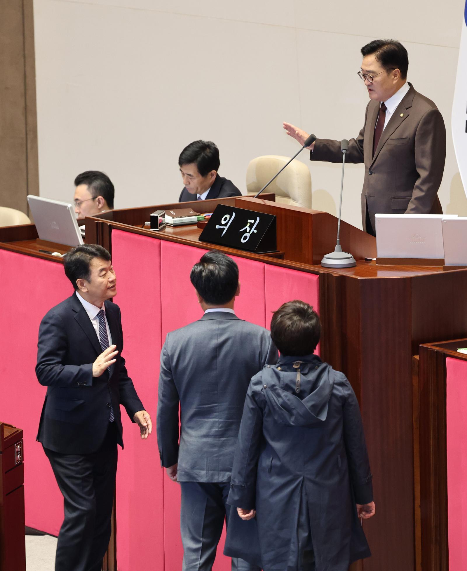 민생 법안 처리를 위해 열린 국회 본회의에서 여야가 고성과 야유를 주고받으며 충돌했다. 김윤덕 국토교통부 장관의 본회의 불참과 검찰의 대장동 항소 포기를 두고 여야 의원들이 맞붙은 것. 여야가 통과시키기로 합의한 항공보안법 개정안도 더불어민주당 주도로 부결됐다. 국민의힘 의원들은 13일 본회의에서 김 장관의 불참에 항의하며 국토교통위원회 소관 안건 표결을 거부하고 일제히 퇴장했다. 우원식 국회의장이 국토위 안건 상정에 앞서 김 장관 불출석 소식을 알리자 국민의힘 송언석 원내대표는 “국무위원에게 본회의 법안 처리보다 중요한 게 뭐가 있다고 본회의에 안 나오느냐”며 반발했다. 김 장관은 이날 오세훈 서울시장과 오찬을 한 뒤 자율주행차 스타트업 간담회와 국토부 노조위원장과의 면담 일정을 소화했다.국민의힘 의원들이 퇴장하자 민주당은 여야 합의로 통과시키기로 했던 항공보안법 개정안을 부결시켰다. 민주당 일부 의원이 국민의힘이 주도한 법안이라는 이유로 “반대해”라고 외치며 부결을 주도한 것. 국민의힘 김은혜, 배준영 의원이 대표 발의한 해당 법안은 항공기 보안점검 의무 위반 처벌을 강화하는 내용을 담고 있다. 같은 당 유상범 원내수석부대표는 “여야가 합의한 법안을 화풀이 식으로 부결시킨 건 매우 치졸한 행태”라고 비판했다. ‘인사 생략 논란’도 불거졌다. 대장동 항소 포기 관련 찬반 토론에서 국민의힘 곽규택 의원이 본회의장 연단에 오를 때 우 의장에게 목례를 하지 않은 것. 우 의장은 “인사 안 하고 올라가느냐”며 불편한 기색을 보였고 민주당 의원들은 “빨리 인사해”라며 고성을 질렸다. 곽 의원은 “소관 법률안을 통과시킬 때는 담당 국무위원이 출석해야 하는 것이 국회법에 정해져 있다. 이것을 무시하는 국회의장에게 인사할 수가 없다”고 했다. 이 과정에서 민주당 장경태 의원은 국민의힘 의원들이 본회의장을 빠져나가자 “본회의장이 중요하다더니 나가고 자빠졌다”고 소리쳤다. 이후 민주당 의원들이 퇴장으로 맞불을 놓자 송 원내대표가 “투표해야 하는데 어디 가느냐”고 외쳤고, 민주당 부승찬 의원은 “한 주먹거리도 안 되는 게”라고 맞받았다. 이에 송 원내대표가 “야, 이리 와봐”라고 소리치며 험악한 상황이 연출되기도 했다. 본회의 산회 후 국민의힘 최은석 원내수석대변인은 “장경태, 부승찬 의원이 욕설에 가까운 막말로 모욕감을 안겨줬다. 엄중히 책임을 묻겠다”고 했다. 한편 이날 본회의엔 국민의힘 추경호 의원에 대한 체포동의안이 보고됐다. 12·3 비상계엄 당시 원내대표였던 추 의원은 국회 계엄 해제 표결을 방해했다는 혐의를 받고 있다. 추 의원 체포동의안은 여야 합의에 따라 27일 본회의에서 표결이 진행된다.조응형 기자 yesbro@donga.com이축복 기자 bless@donga.com}