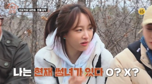 이날 박명수가 “산에서 비밀 얘기한 것 없냐”고 묻자 하니는 “있다”고 밝혔다. 이어 진행된 OX 진실게임. 하니는 “현재 썸 타고 있는 사람이 있느냐”고 물었고 김민종은 망설임 없이 “있다”고 대답했다.
