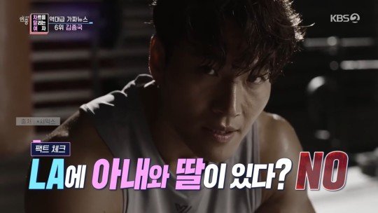 6위는 LA에서 비밀 결혼식을 올리고 단란한 가정을 이루고 살고 있다는 의혹을 받았던 가수 김종국이다. 평소 LA에 자주 놀러가는 것으로 알려진 그에 대해 절친한 ‘런닝맨’ 멤버들과 차태현 등은 마치 그곳에서 결혼해 아이가 있는 것처럼 이야기를 했다. 이런 장난이 쌓여 실제처럼 둔갑됐고 소문이 부풀려지며 가짜뉴스까지 생산됐다.