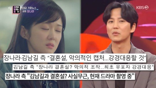 당시 해외에서 예능 프로그램을 녹화 중이던 김남길은 기차 안에서 “내가 결혼한다더라”며 실시간으로 황당한 기색을 드러냈고, 여자 배우에게 더 타격이 있다며 장나라를 걱정했다. 당시 장나라는 SNS에 “앞으로도 이런 일이 계속 있을까 두렵다”고 심경을 고백했다.