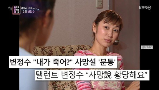 3위는 2003년 7월 15일 갑자기 사망설에 휩싸였던 모델 겸 배우 변정수다. 당시 온라인을 중심으로 사망설이 급격하게 퍼졌고 드라마 촬영 중이었던 그는 뒤늦게 수사 의로, 최초 유포자는 자수했다.