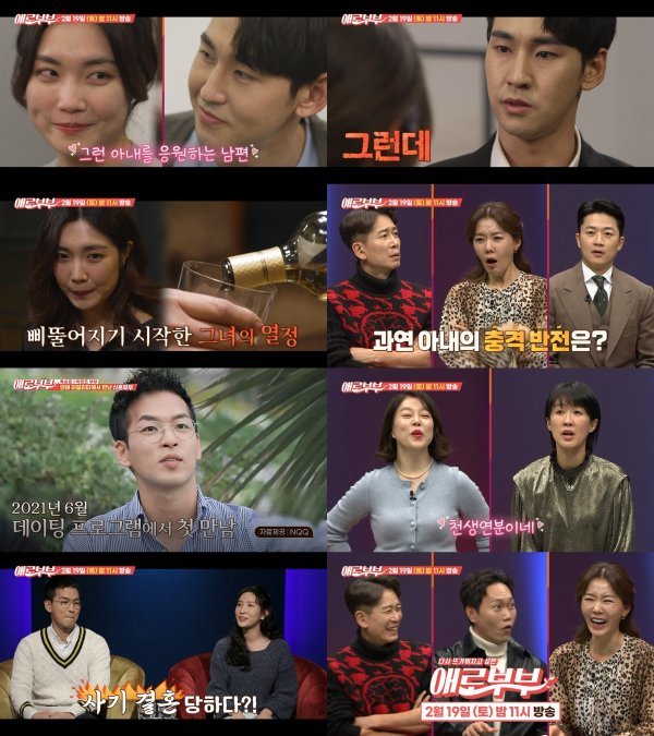 하지만, 아내 박정은은 남편을 보고 한숨을 쉬었고, 남편 육승준은 “뭐? 얘기해”라고 덤덤하게 답했다. 이에 박정은은 “이건 사기 아닌가?”라며 결혼생활에 문제를 제기했다. MC 양재진, 송진우, 안선영의 웃음이 끊이지 않게 만든 이들의 속사정은 과연 무엇일지 기대를 모은다.