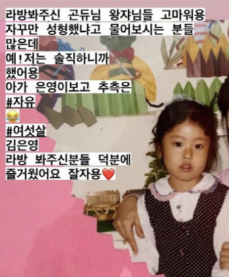 그러면서 6살 시절의 자신의 사진을 공개하며 “아가 은영이 보고 추측은 자유”라고 덧붙였다. 귀엽고 동글동글한 외모가 지금의 모습과 닮았다.