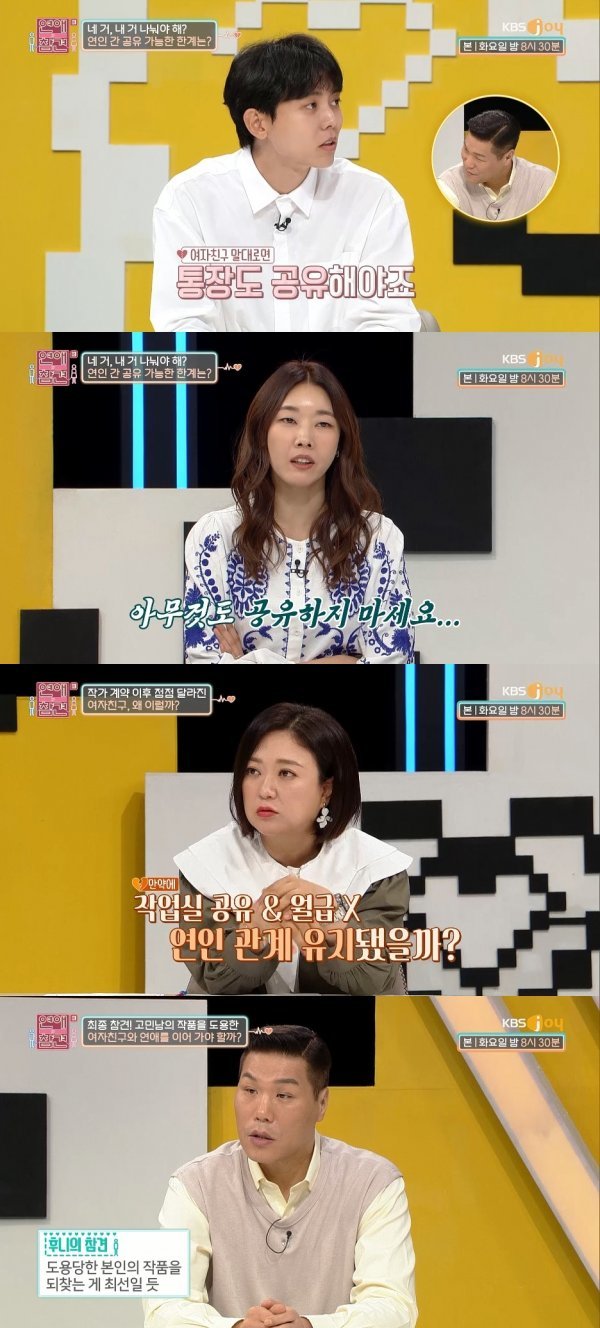 주우재는 "여자친구 말에는 모순이 있다. 네 것 내 것 나누지 말자면서 그동안 고민남 월급은 왜 줬나. 그냥 통장을 같이 써야지"라며 "고민남에게 상의한 것도 아니고 몰래 복제한 건데 여자친구는 자신이 고민남 앞에서 뻔뻔해도 되는 사람이라고 생각하는 거 같다. 고민남은 집필에 집중해서 여자친구 뛰어넘는 작가가 돼라"라고 조언했다.