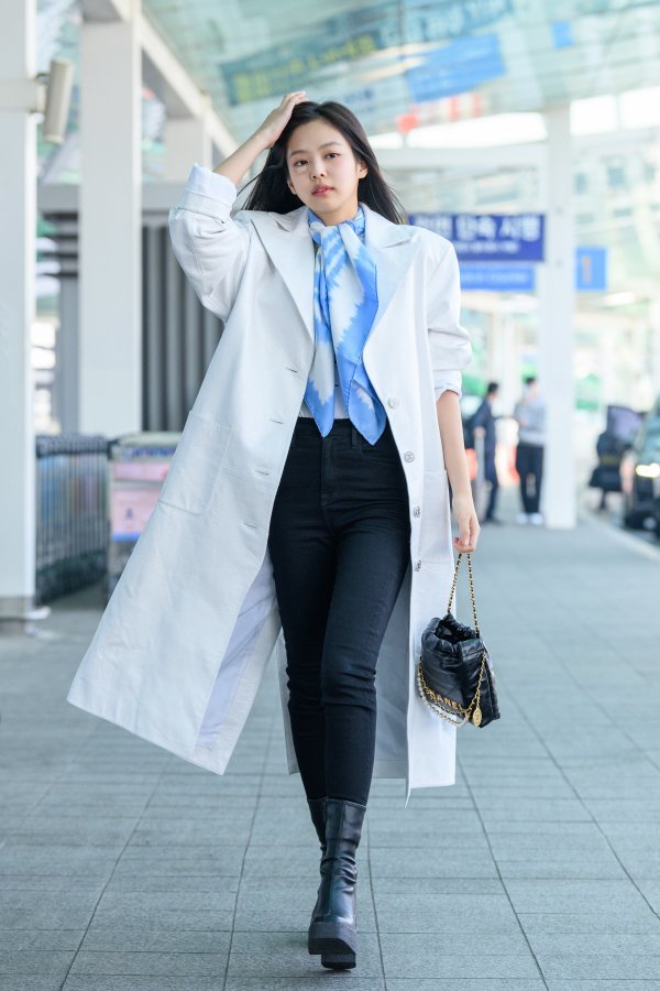 6일 오전 제니는 앰버서더로 활동 중인 한 명품 브랜드의 2023/24 가을-겨울 레디-투-웨어 컬렉션 쇼 참석을 위해 인천국제공항을 통해 파리로 출국했다. 이날 그는 화이트 롱 트렌치 코트에 세련된 미니백을 매치하며 패셔니스타다운 면모를 보였다.