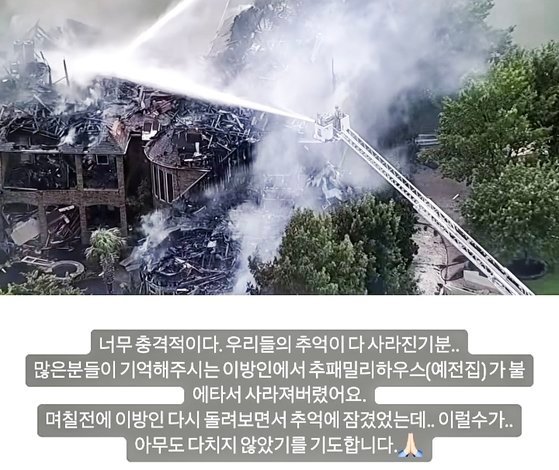 추신수의 아내 하원미는 10일 자신의 인스타그램에 “너무 충격적이다. 우리의 추억이 다 사라진 기분”이라며 “많은 분이 기억해 주시는 JTBC ‘이방인’에서 추패밀리하우스가 불에 타 사라져 버렸다”고 알렸다. 이어 “며칠 전 ‘이방인’을 다시 돌려보면서 추억에 잠겼는데 이럴 수가. 아무도 다치지 않았기를 기도한다”고 말했다.