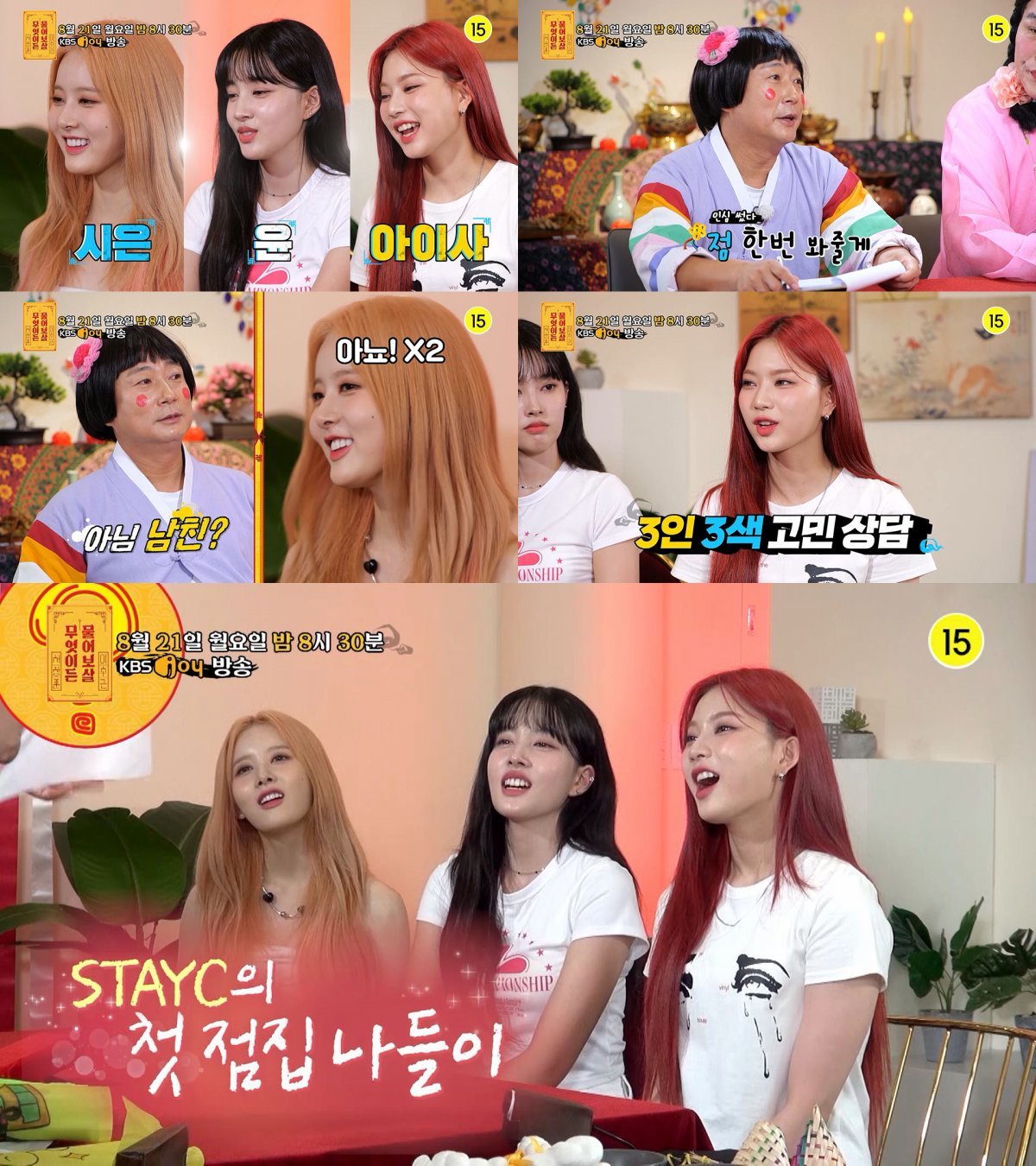 21일 저녁 8시 30분 KBS JOY 채널에서 방송되는 ‘무엇이든 물어보살’에는 과즙미가 팡팡 터지는 대세 걸그룹 스테이씨가 보살집을 찾아와 현장에 활기를 불어넣었다.