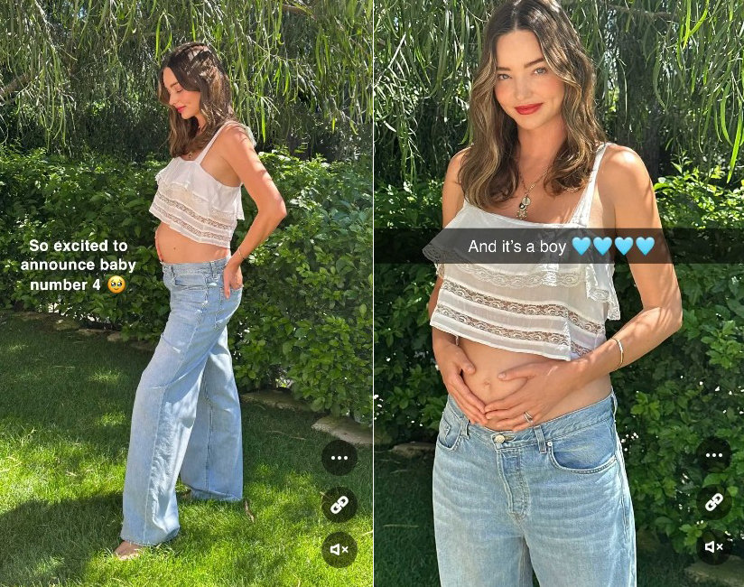 2일 미란다 커는 자신의 SNS를 통해 “네 번째 아이를 발표하게 되서 너무 기쁘다. 아들이다”라고 밝히며 크롭티를 입고 D라인을 공개해 눈길을 끌었다. 더불어 신발 네 켤레를 나란히 둔 사진을 공개하며 기쁜 마음을 드러냈다.
