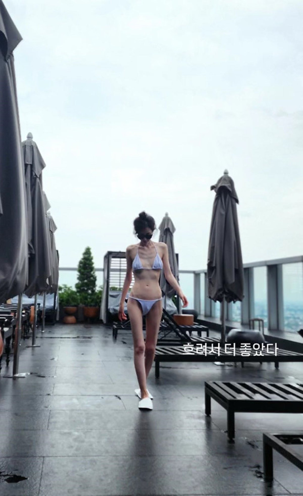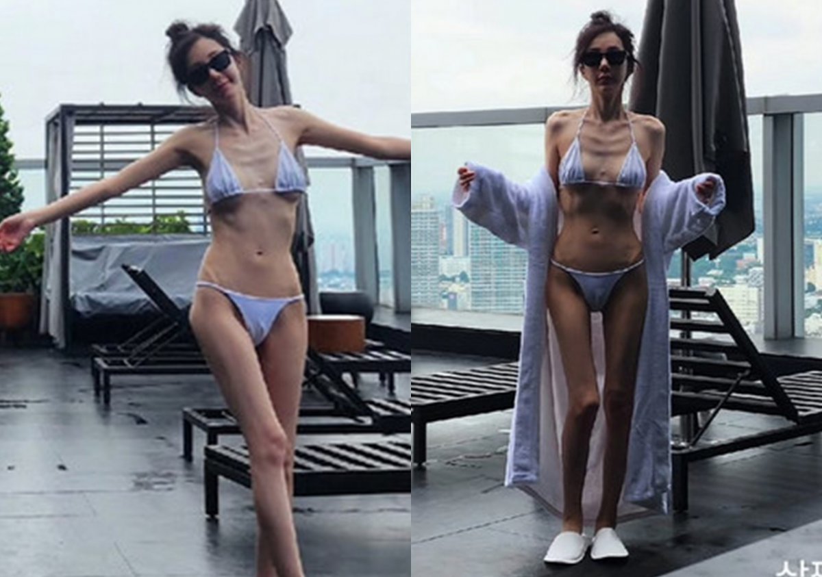 사진 속 신주아는 흐린 날씨에 호텔 옥상에서 비키니를 입고 다양한 포즈를 취하고 있다. 군살은커녕 뼈가 그대로 드러난 종잇장 몸매로 시선을 사로잡앗다.