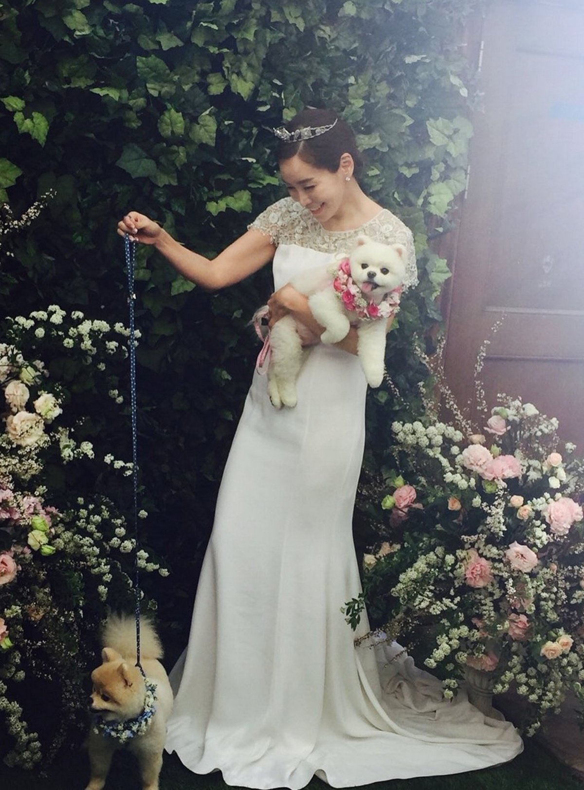 함께 공유한 사진은 웨딩 화보 촬영 현장으로 보인다. 웨딩드레스를 입은 김정은은 두 반려견과 포즈를 취하고 있다. 특히 턱시도를 입은 남편의 얼굴 일부를 공개해 눈길을 끈다.