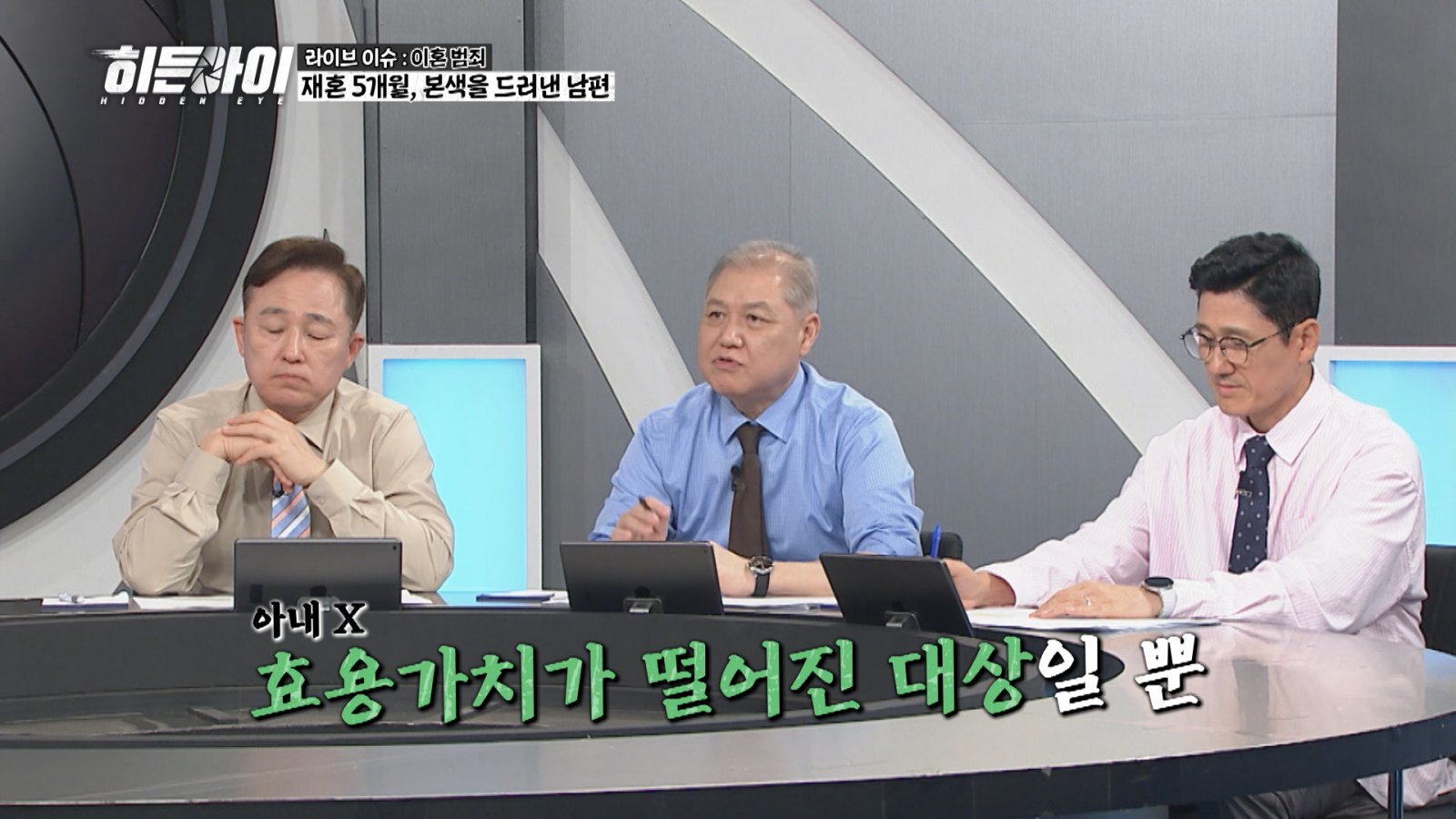 라이브 이슈에서는 한 가정을 피로 물들인 이혼 범죄를 파헤친다. 겉으로는 자상한 가장이었지만, 실상은 아내가 번 돈으로 생활하며 여러 여성과의 외도를 일삼은 남편. 아내를 ‘금고’라 부르며 돈줄로만 여겼던 남편의 행동에 참다못한 아내는 빌려준 돈을 갚으라고 했고, 남편은 불같이 화를 내며 오히려 아내에게 이혼을 요구했다. 아내가 그의 요구에 응하지 않자 결국 9살 딸 앞에서 흉기를 휘둘러 아내를 살해했고, 그 소리에 달려온 장모마저 공격하는 극악무도한 범죄를 저질렀다. 이후 재판이 진행되던 중 남편의 누나가 아내의 유가족에게 상상 초월의 발언을 쏟아내자, 스튜디오는 순식간에 싸늘하게 얼어붙었는데. 프로파일러 권일용이 “아내가 아닌, 효용가치 떨어진 대상으로 보고 범행을 저질렀던 것”이라 분석한 이혼 사건의 전말은 8월 25일(월) 저녁 7시 40분, MBC 에브리원 ‘히든아이’에서 확인할 수 있다.