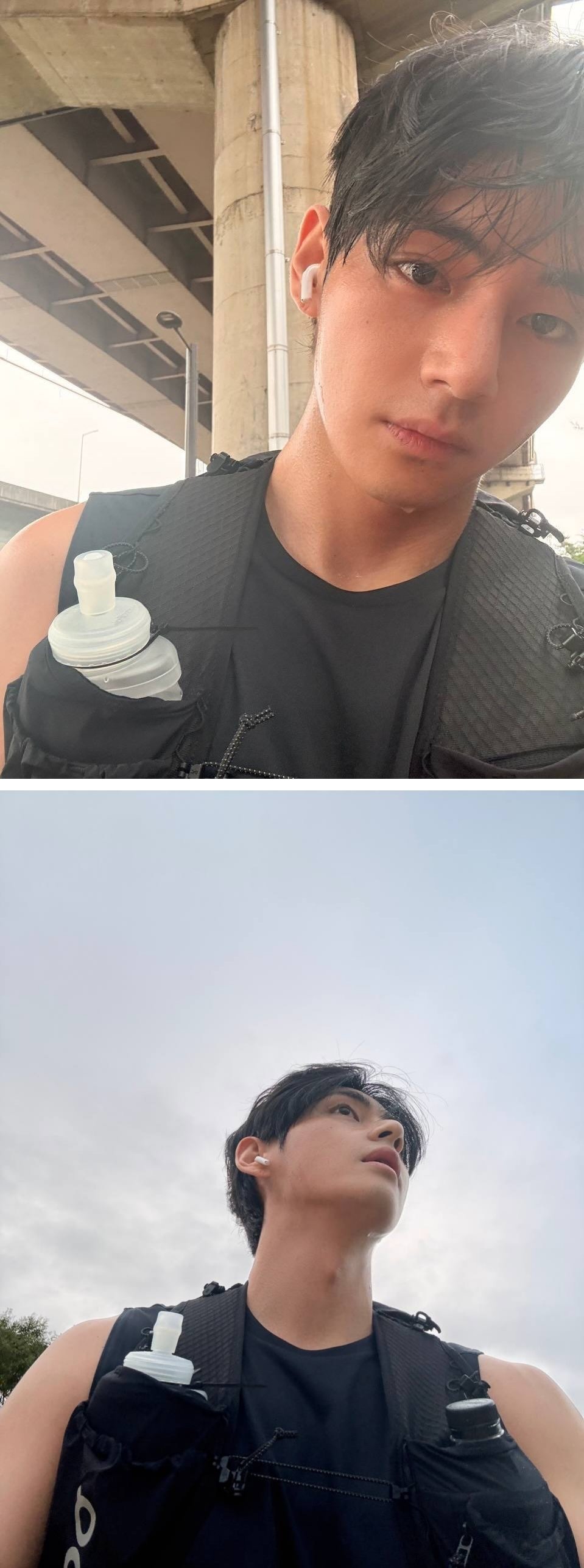 카키색 상의에 레드 반바지를 매치한 운동복 차림도 함께 공개됐다. 마스크로 얼굴 일부를 가렸으나 은은하게 드러나는 잘생김은 가릴 수 없었다. 햇빛 아래 장난기 어린 표정을 짓는 사진에서는 편안한 분위기와 청순한 매력이 동시에 느껴졌다.
