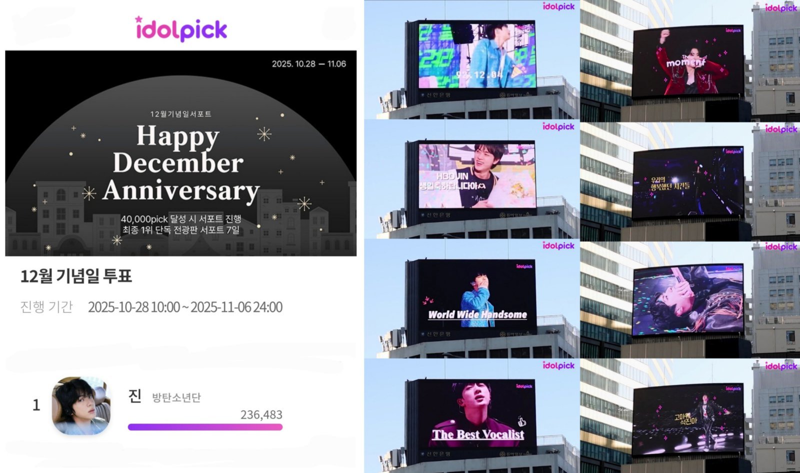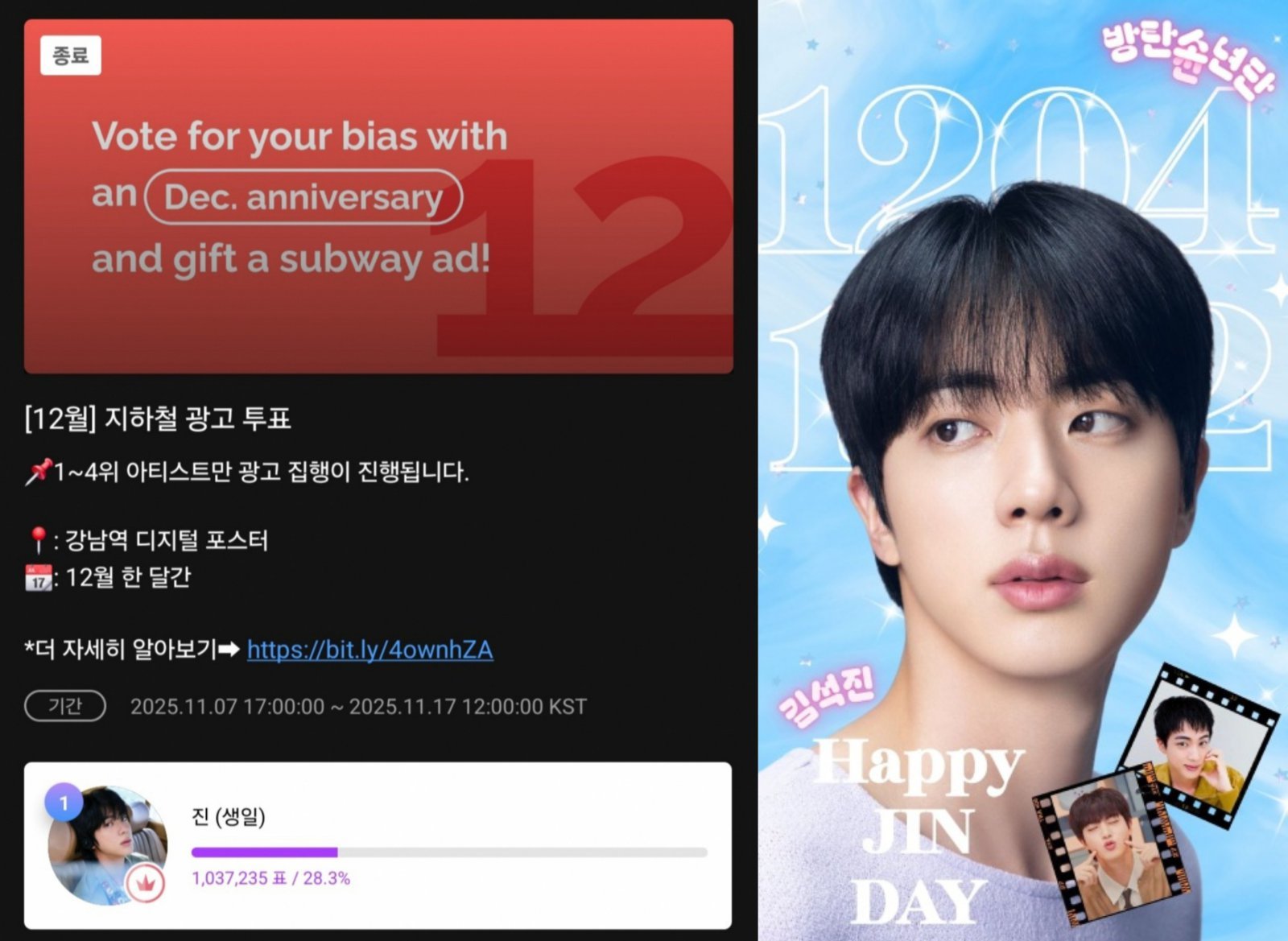 방탄소년단 진은 글로벌 팬덤 플랫폼 뮤빗이 11월 7일부터 17일까지 실시한 ‘12월 생일·데뷔 기념일 지하철 광고’ 투표에서도 103만7235표(득표율 28.3%)로 정상에 올랐다. 우승 리워드인 강남역 디지털 포스터 광고는 12월 한 달간 송출되며, 팬들이 직접 디자인에 참여한 축하 메시지가 더해진 것이 특징이다.