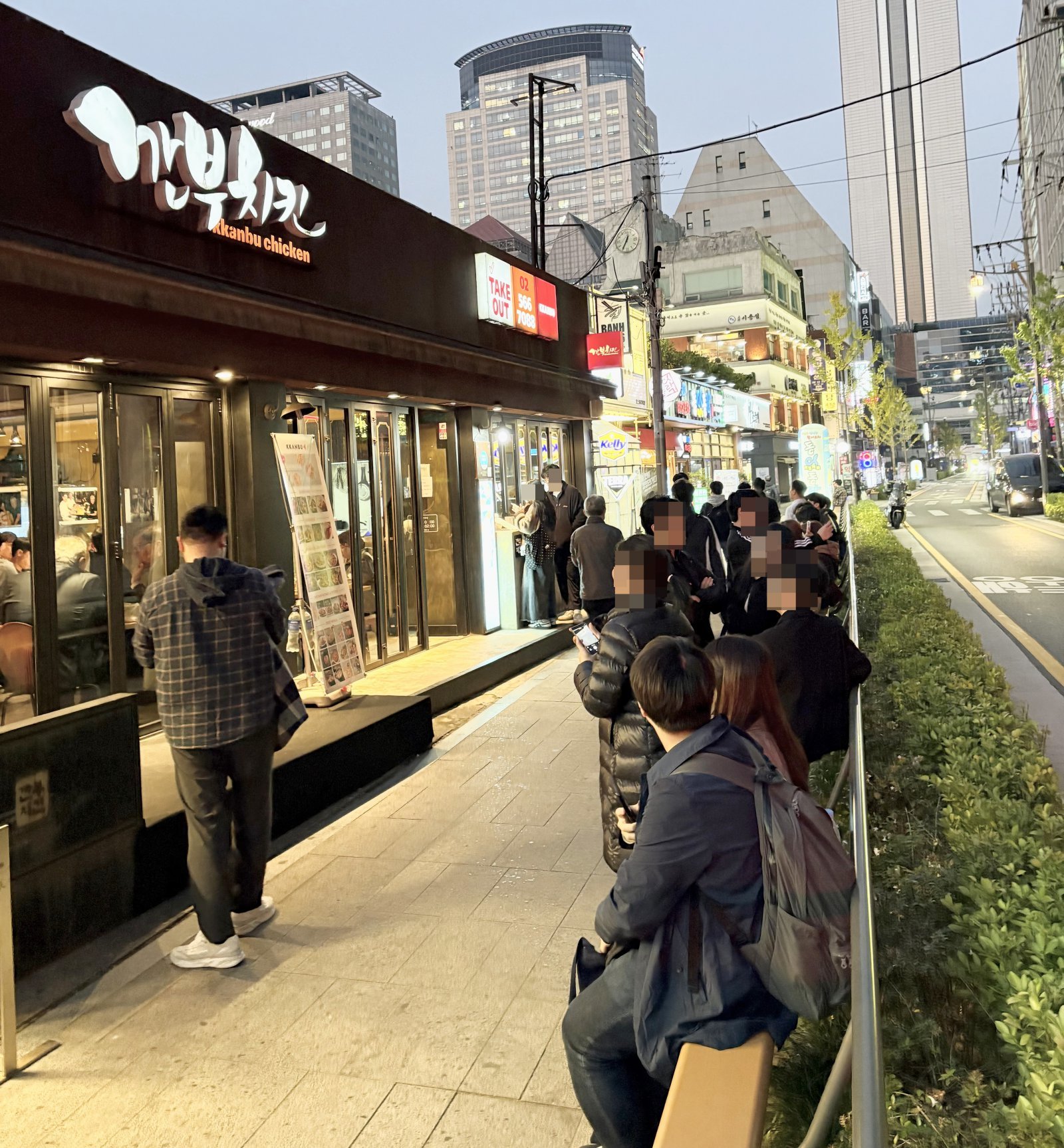 오후 5시 무렵, 서울 삼성역 인근 깐부치킨 앞. 젠슨 황 ‘치맥 회동’ 열풍에 손님들이 길게 줄을 서 있었다. 2025.11.04 황수영 기자 ghkdtndud119@donga.com