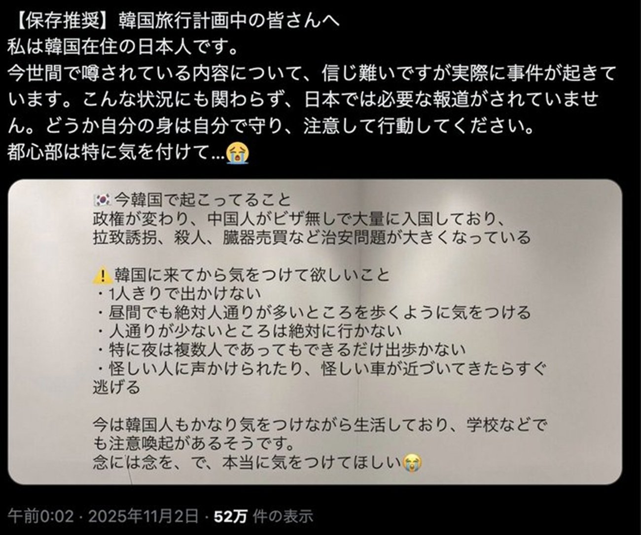 일본 SNS ‘X(옛 트위터)’에 올라온 한국 여행 주의 게시물. 사진=X 갈무리