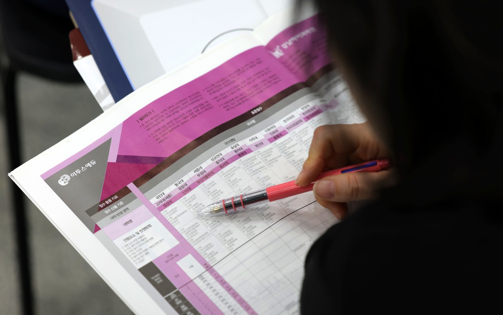 15일 오후 서울 강남구 강남하이퍼학원 본원에서 열린 2026 수능 가채점 설명회를 찾은 학부모들이 정시 배치 참고표를 살펴보고 있다. 2025.11.15 뉴시스