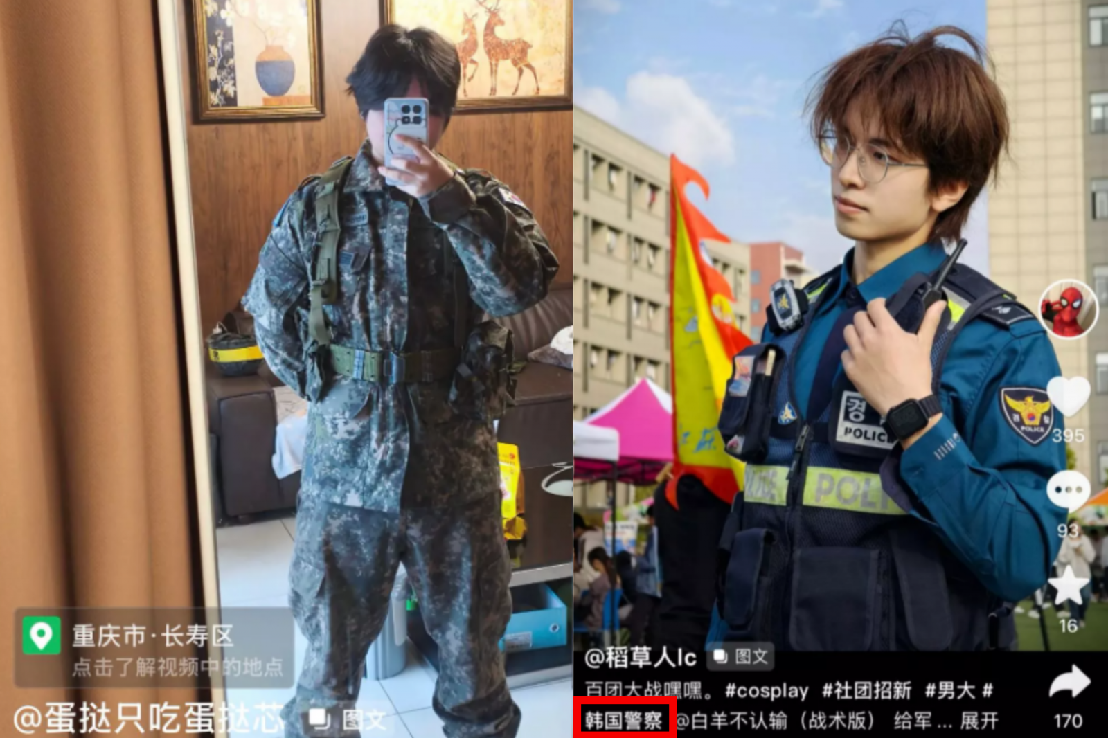 중국 SNS에서 한국 군복·경찰 제복을 모방한 코스프레가 확산되며 공권력 상징 희화화 우려가 커지고 있다. 양국 법률 모두 제복 오용을 금지하지만 온라인에서는 규제가 어려운 실정이다. 사진=더우인