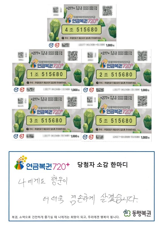 19일 복권 수탁사업자 동행복권은 제277회차(8월 21일 추첨) ‘연금복권720+’ 1등(1매)·2등(4매) 동시 당첨 사연을 소개했다.