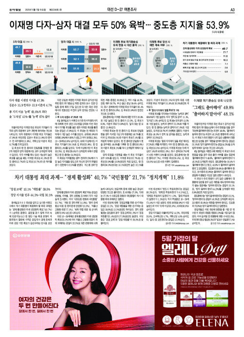이재명 다자-삼자 대결 모두 50% 육박… 중도층 지지율 53.9%