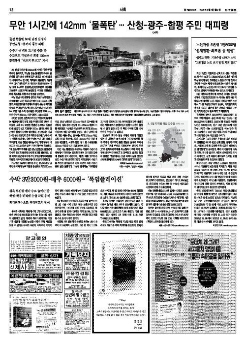무안 1시간에 142㎜ ‘물폭탄’… 산청-광주-함평 주민 대피령