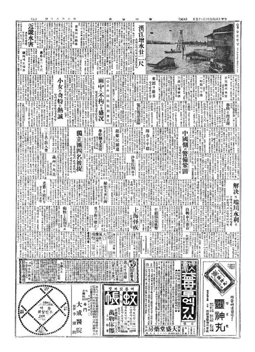 - 漢江增水廿二尺(한강증수입이척) 손해는아직까지별로업다