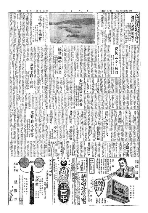 - 龍山方面浸水(룡산방면침수) 물이빠지지못하야 구룡산뎐차도불통