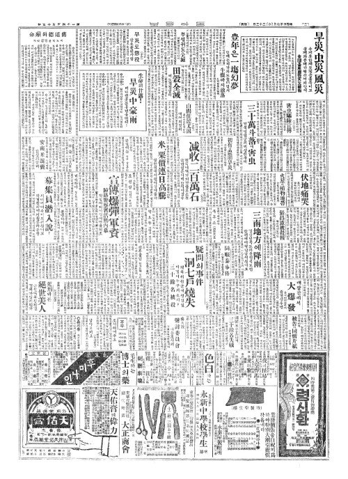 - 旱災(한재)、虫災(충재)、風災(풍재) 수재후한재로첫숨을죽이고 츙재와풍재가뿌리까지끈어 全國(전국)을風靡(풍미)한天災續報(천재속보)