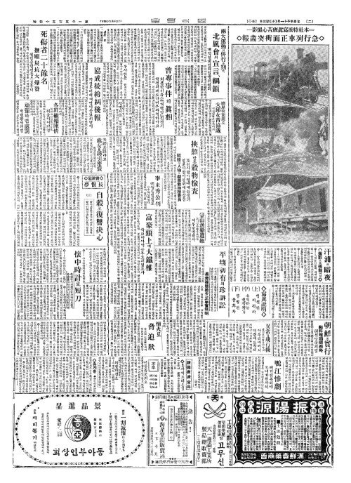 - 本社特派寫眞班苦心撮影(본사특파사진반고심촬영)= ◇急行列車正面衝突畵報(급행렬차정면충돌화보)◇