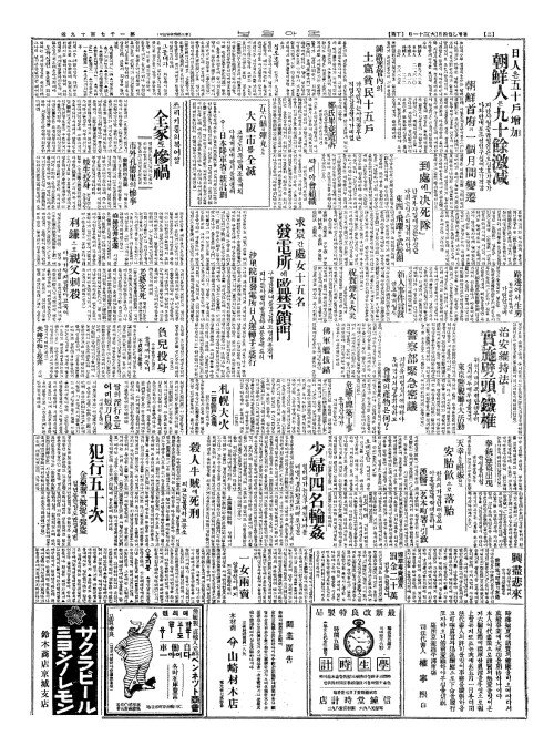 - 日人(일인)은五十戶增加(오십호증가) 朝鮮人(조선인)은九十餘激减(구십여격감)