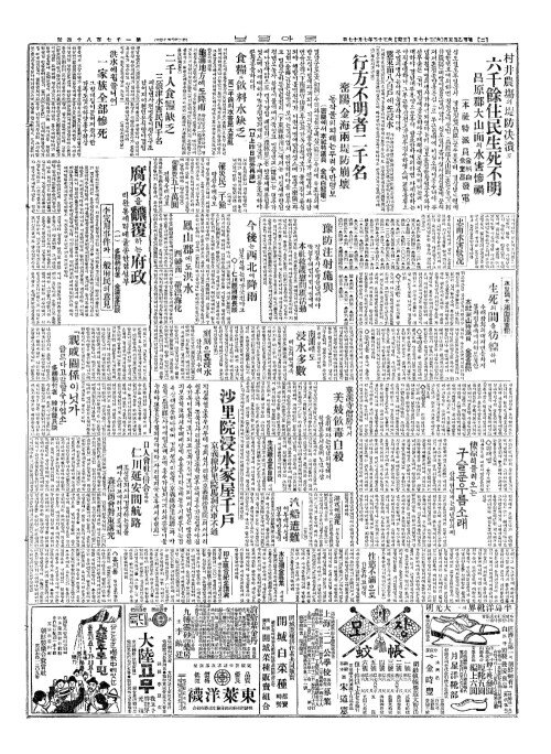 - 村井農塲(촌정농장)의堤防决潰(제방결궤)로 六千餘住民生死不明(륙천여주민생사부명)
