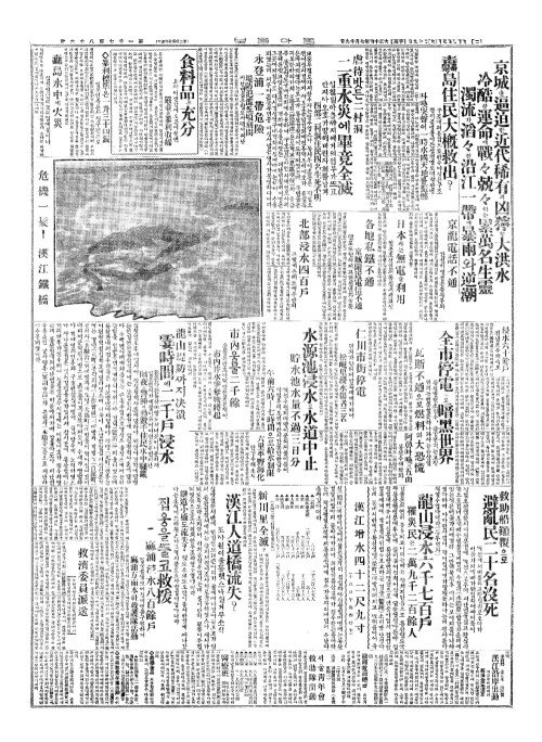 - 京城(경성)을逼迫(핍박)한近代稀有(근대희유)의兇獰(흉녕)한大洪水(대홍수) 冷酷(랭혹)한運命(운명)에戰(전)々兢(긍)々하는累萬名生靈(라만명생령) 濁流(탁류)가滔(도)々한?江一帶(강일대)에暴雨(폭우)와逆潮(역조)