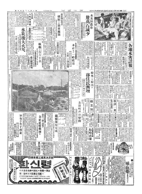 - ?江一帶(강일대)의水災(수재)와 各社直接救濟(각사직접구제)는 작이십오일까지로중지