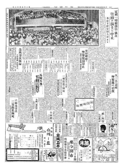 - 定刻一時前滿員(정각일시전만원)의盛况(성황) 劈頭(벽두)의演士(연사)는『中止(중지)』本社主催雄辯大會第一日(본사주최웅변대회제일일)