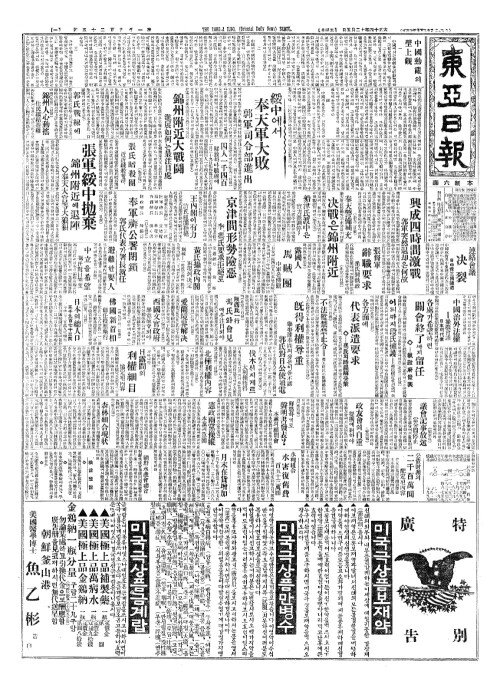 - 錦州附近大戰鬪(금주부근대전투) 進展如何(진전여하)는最注目處(최주목처)
