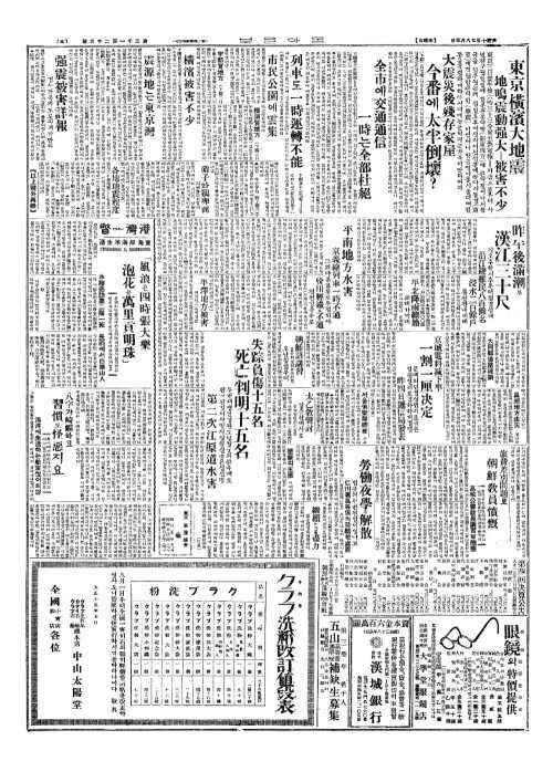 - 東京(동경)、橫濱大地震(횡빈대지진) 地鳴震動强大(지명진동강대)=被害不少(피해부소)