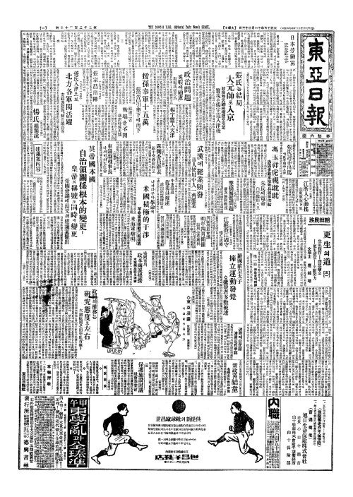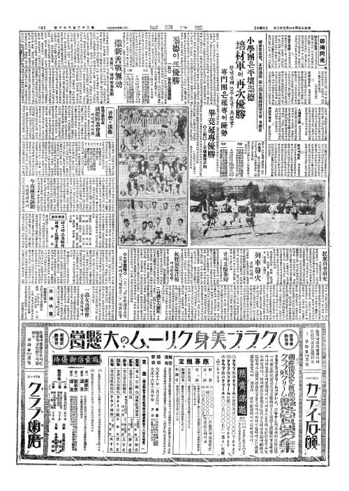 - 體育會主催(체육회주최)、本社後援(본사후원) 第七回全朝鮮蹴球大會(제칠회전조선축구대회) 决勝日(결승일) 小學團(소학단)은平壤崇德(평양숭덕) 培材軍(배재군)이再次優勝(재차우승)