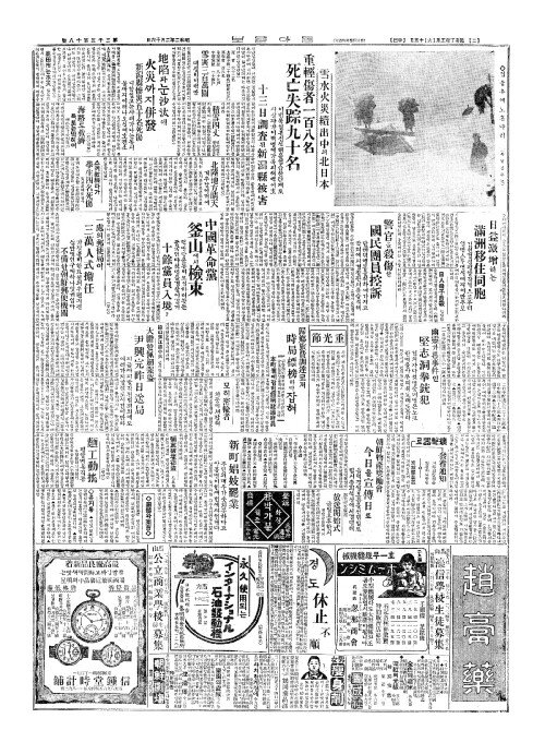 - 雪水火災續出中(설수화재속출중)의北日本(배일본) 重輕傷者一百八名(중경상자일백팔명) 死亡失踪九十名(사망실종구십명)